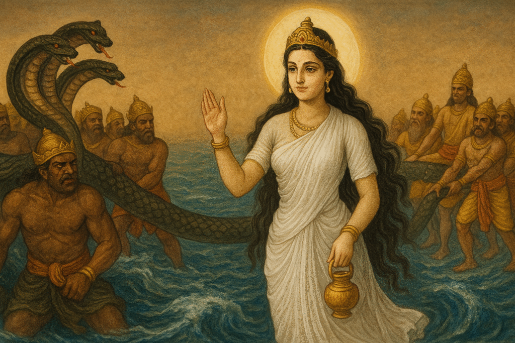 Long ago, the Devas (gods) and Asuras (demons) decided to churn the ocean of milk to get Amrit (nectar of immortality). With the help of Mount Mandara and Vasuki (the serpent), they churned the ocean.